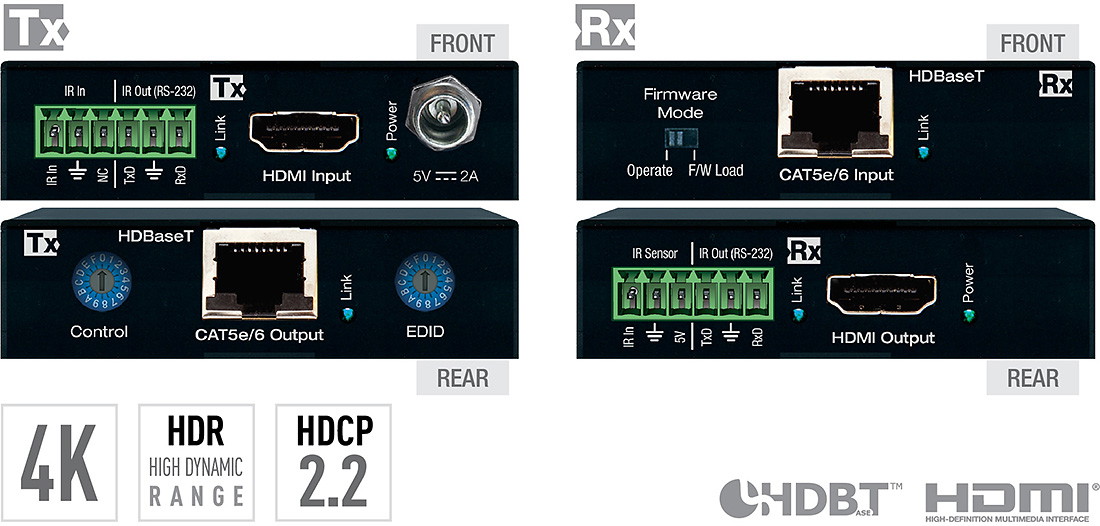 Ponieważ urządzenie jest wykonane w standardzie HDBaseT umożliwia ono transmisję sygnałów sterujących IR oraz RS-232 w obu kierunkach. Odpowiednie porty w postaci euroblock znajdują się w nadajniku i odbiorniku. W komplecie producent dostarcza również diody podczerwieni: nadawczą i odbiorczą. Do regulacji parametrów transmisji IR, RS-232 oraz kontroli bitu HPD (Hot Plug Detecion) służy obrotowy przełącznik Control.